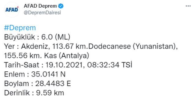 Son Dakika: Akdeniz açıklarında 6 büyüklüğünde deprem! Sarsıntı Antalya ve çevresinde hissedildi.AFAD verilerine göre Akdeniz açıklarında 6 büyüklüğünde bir deprem meydana geldi. Sarsıntı Antalya ve çevresinde, Isparta, Aydın ve Denizli'de de hissedildi. Sabah 8:32'de Akdeniz'de Kaş açıklarında 6 büyüklüğünde bir deprem meydana geldi. Depremin Antalya ve çevresinde, Isparta, Aydın ve Denizli'de de hissedildiği öğrenildi. AFAD verilerine göre deprem, 9.59 km derinlikte gerçekleşti. Kandilli Rasathanesi ise depremin şiddetini 6.1 olarak açıkladı.
