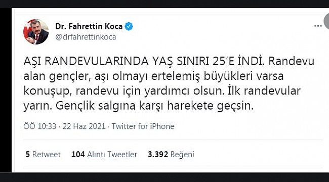 Geçen yıldan itibaren bütün dünyayı etkileri altına alan koronav-irüs ile mücadele bütün süratiyle devam ediyor. Koronav-irüs ile mücadelede a-şılama da bütün süratiyle sürüyor. Sıhhat Bakanı Fahrettin Koca ve Cumhurbaşkanı Recep Tayyip Erdoğan, koronav-irüs a-şılama sayısında başka ülkelerden önde olduğumuzu gerçekleştirdikleri konuşmalarında belirtmişti.Kategori kategori oluşturulan aşılamada sınır 25 yaş altına düştü. Sıhhat Bakanı Fahrettin Koca ve Cumhurbaşkanı Recep Tayyip Erdoğan, koronav-irüs a-şılama sayısında başka ülkelerden önde olduğumuzu gerçekleştirdikleri konuşmalarında belirtmişti. Açıklamayı ise Sıhhat Bakanı Fahrettin Koca, sosyal medya hesabından paylaşarak duyurdu. Sağlık Bakanı Fahrettin Koca, sosyal medya hesabından yaptığı paylaşımında şu i-fadelere de yer verdi. ”İlk randevular yarın. Gençlik s-algına karşı harekete geçsin.” dedi.