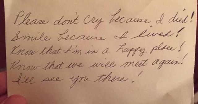 Adam Eşinin Cüzdanında B'akın Nasıl Bir Not Buldu…Jimmy ve Billie Breland 1954 yılında dünya evine girdiler. Hayata dair bütün güzel olayları tecrübe ettiler. Yıllar geçtikçe çocukları ve sonra da torunları oldu. Beraber geçirdikleri 60 yılın ardından Billie hayata gözlerini yumdu. Jimmy, günlerce hastanede eşinin yanında bekledi. 13 Ocak 2015 tarihinde Billie ebedi uykuya daldı. İki gün sonra Jimmy cüzdanında el yazısı ile yazılmış bir mektup buldu.Evlilikleri boyunca Billie gerek markete giderken gerekse de başka amaçlar için kendisine küçük notlar hazırlıyordu. Jimmy, cüzdanında yine böyle bir not görünce, bunun önemsiz olduğunu düşündü. Ancak mektubu açınca hiç beklemediği türden bir şeyle karşılaştı. Ben o-lünce lütfen ağlama! Geçirdiğimiz yılları hatırla ve gülümse. Gideceğim yerde mutlu olacağımı hatırla! Tekrar bir araya geleceğimizi hatırla! Tekrar buluşacağız!Meğerse Billie yıllardır bu notu cüzdanında taşıyormuş. Jimmy’nin eline kendisi v-efat edince bir şekilde geçeceğini biliyormuş. Kulağa basit gelen ancak Jimmy için dünyalara bedel olan mesaj, eşinin yasını tutmakta kendisine yardımcı oldu. Torunlarından Cliff Sims, Yellowhammernews’e “Tekrardan buluşacağınızı ve bu sefer hiç ayrılmayacağınızı bilmenin rahatlığını ve huzurunu özetliyor aslında not” dedi.Gerçek aşklar sonsuza dek devam eder.