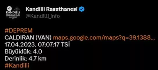 Kandilli Rasathanesi de depremin büyüklüğünün 4 olarak açıklarken derinliğinin 4.7 kilometre olduğunu bildirdi.