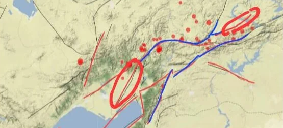 Yukarıdaki haritadaki kırmızı noktalar stres yüklenen bölgelerdir hem Kozan Ceyhan'da hem de Yeşilyurt'ta olan bölgeler bu kırmızı alandadır ve bu depremler de bunların üzerinde oluşmuştur. Son haritada Kozan Ceyhan hattındaki Adana Ceyhan'daki depremleri görmekteyiz son yüzyılda 6 ve 6.5'a ulaşan depremler burada oluşmuştur. Bunun kuzeydoğudaki ucunda ise Yeşilyurt fay hattı doğuya doğru uzanan bir fay hattıdır burada olan depremde bu faydadır ve bu 6 Şubat depremlerinde kırılmayan uç kesimlerde olan depremlerdir bir Ceyhan öbürü Yeşilyurt faylarıdır.