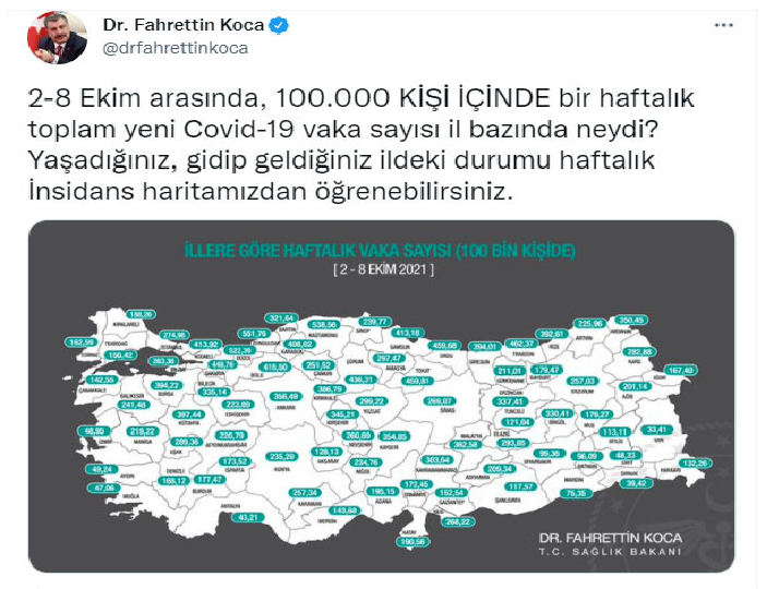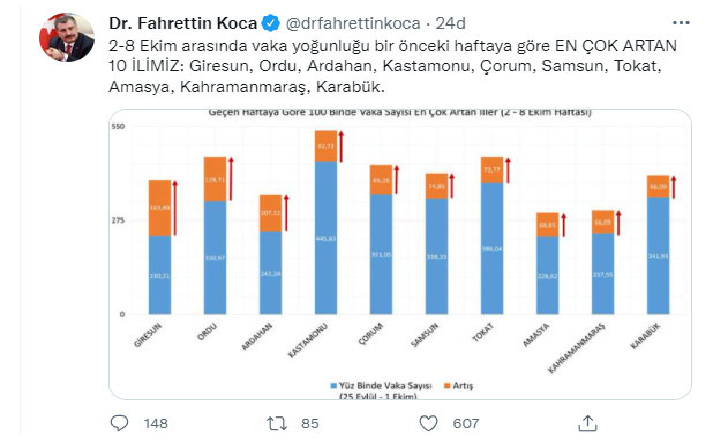 2-8 Ekim arasında 100 bin kişide görülen haftalık v-aka haritası açıklandı. V-aka sayısı en çok artan iller Giresun, Ordu, Ardahan. Kastamonu, Çorum, Samsun, Tokat. Amasya, Kahramanmaraş, Karabük oldu. Peki büyükşehirlerde son durum ne?Sağlık Bakanı Fahrettin Koca, 2-8 Ekim'de illere göre her 100 bin kişide görülen K-ovid-19 v-aka sayılarını açıkladı.Bakan Koca'nın, Twitter'dan paylaştığı Türkiye haritasında yer alan verilere göre, 2-8 Ekim'de her 100 bin kişide görülen K-ovid-19 v-aka sayısı İstanbul'da 274,98, Ankara'da 356,49, İzmir'de 48,95 oldu. Bu sayılar bir önceki hafta (25 Eylül-1 Ekim) İstanbul'da 252,11, Ankara'da 363,69, İzmir'de 47,01 olarak kayda geçmişti.Bakan Koca, v-aka y-oğunluğu bir önceki haftaya göre en çok artan 10 ilin Giresun, Ordu, Ardahan, Kastamonu, Çorum, Samsun, Tokat, Amasya, Kahramanmaraş, Karabük olduğunu belirtti. İllere göre 2-8 Ekim'de her 100 bin nüfusta görülen K-ovid-19 va-ka sayıları (yüksekten düşüğe doğru) şöyle gerçekleşti:"Zonguldak (551,76), Kastamonu (538,56), Düzce (522,39), Trabzon (462,37). Tokat (459,81), Ordu (459,68), Sakarya (448,76). Çorum (436,31), Bolu (415,50). Kocaeli (413,92), Samsun (413,18). Karabük (408,02), Kütahya (397,44), Bursa (394,22). Giresun (394,01), Rize (392,61), Kırıkkale (386,79). Malatya (362,58), Ankara (356,49). Kayseri (358,85), Ardahan (350,45), Kırşehir (345,21). Erzincan (337,41), Bilecik (335,14), Bingöl (330,41). Bartın (321,64), Kahramanmaraş (303,64). Yozgat (299,22), Amasya (297,47), Elazığ (293,05), Uşak (289,36), Kars (282,88).İstanbul (274,98), Sivas (269,07), Kilis (268,22), Yalova (263,36). Nevşehir (260,69), Karaman (257,34). Erzurum (257,03), Çankırı (251,52), Balıkesir (241,48). Sinop (239, 77), Konya (235,29), Niğde (234,76). Artvin (225,96), Eskişehir (223,89), Afyonkarahisar (220,79). Manisa (219,22), Gümüşhane (211,01). Adıyaman (209,34), Ağrı (201,14), Adana (195,15). Hatay (190,56), Kırklareli, (188,26), Bayburt (179,47). Muş (179,27), Burdur (177,47), Isparta (173,52), Osmaniye (172,45). Denizli (168,12), Iğdır (167,4), Edirne (162,69), Tekirdağ, (156,42). Gaziantep (152,54), Mersin (143,68). Çanakkale (142,55), Hakkari (132,26). Aksaray (128,13). Tunceli (121,04), Şanlıurfa (117,57), Bitlis (113,11). Diyarbakır (99,36), Batman (96,09), Mardin (75,35), Aydın (49,24). İzmir (48,95), Siirt (48,33), Muğla (47,06), Antalya (43,21). Şırnak (39,42), Van (33,41).