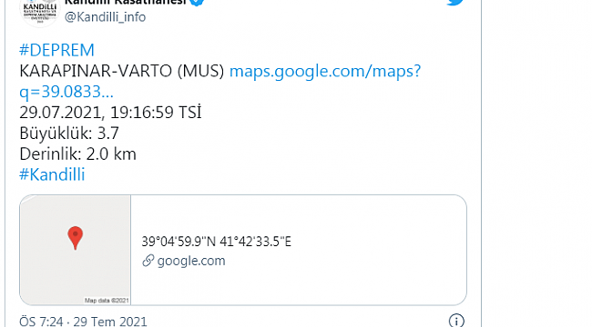 Kandilli Rasathanesi, Muş'ta 3.7 büyüklüğünde bir deprem meydana geldiğini duyurdu.Muş'ta 3.7 büyüklüğünde bir deprem meydana geldi. Kandilli Rasathanesi, saat 19:16'da meydana gelen 3.7 büyüklüğündeki depremin derinliğini 2.0 km olarak açıkladı.