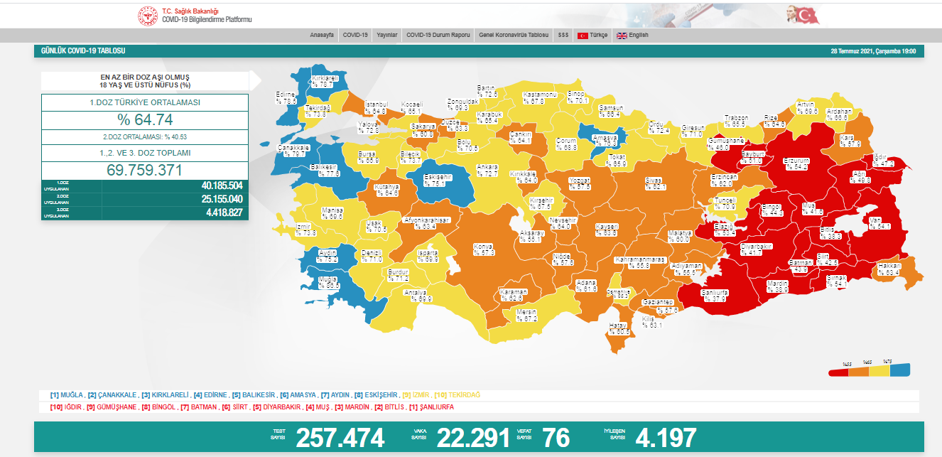 Sağlık Bakanlığı 'Günlük Kovid- 19 Tablosu' verilerini açıkladı. Türkiye'de son 24 saatte koronav-irüsten 76 kişi daha ha-yatını k-aybetti, 22 bin 291 yeni v-aka tespit edildi.Sağlık Bakanı Fahrettin Koca koronav-irüs gündemi ve koronav-irüs a-şısı hakkında açıklama yaptı.Fahrettin Koca a-şı olmayanlara kısıtlama getirileceği i-ddiaları hakkında, "Birinci önceliğimiz, tüm vatandaşlarımızın sorumluluk alarak ve sorumlu bir birey olarak kendi tedbirlerini alması ve a-şı olarak topluma karşı ödevini yerine getirmesidir." i-fadelerini kullandı.Fahrettin Koca'nın açıklamalarının satır başları şöyle oldu:Aziz Vatandaşlarım,Bugün bilim Kurulumuz s-algının ilerleyişi, artan va-ka sayıları ve a-şı programımızı esas alan bir toplantı gerçekleştirdi.Hepinizin bildiği gibi son 2 hafta içinde v-aka sayılarında çok hızlı bir yükseliş yaşadık. Bayram günlerinde h-astalık yok olmadı. Ama üzülerek izledik ki h-astalık yokmuş, hiç olmamış gibi bir tavırla bayramı karşıladık. Tedbirlere dikkatin çok azaldığını üzülerek gördük. Bu günlerde bunun ektisini yaşadığımız bir gerçek. V-aka sayılarının artış hızı istemesek de yükselme eğiliminde. Bu durum birçok açıdan sorun teşkil ediyor.Bunların ilki a-şı programımız toplum bağışıklığı hedefine ulaşamadan yeni bir varyantın baskın hale gelmesi ve a-şı ile bağışıklık programımızı sekteye uğratma riski. Unutmayalım ki en az iki doz a-şı olmadan ve üzerinden belirli bir süre geçmeden bağışıklık elde edilmiyor. Birinci doz a-şısını olmuş vatandaşlarımız henüz bağışıklık kazanmadan v-irüsle karşılaştıklarında h-astalığa yakalanabiliyorlar.Benzer şekilde iki doz a-şı olmuş kişiler için de üzerinden belirli bir süre geçtikten sonra aş-ıların etkinliği azalıyor ve bu durum da ha-stalığa ya-kalanma r-iski ortaya çıkıyor. Bunlar, a-şı programının başarıya ulaşmasının önündeki en önemli ri-sk faktörleridir.İkincisi ise s-algını a-şı ile durdurmaya çalışırken artan v-aka sayılarının unutmak istediğimiz, bir daha dönmek istemediğimiz yakın geçmişteki kısıtlamalarla dolu hayatımıza dönmek. Kısıtlama uygulanan dönemler s-algının sosyal hayatımızı en çok etkilediği, insani ihtiyaçların bile özel planlamalar gerektirdiği günlerdi. Kısıtlama günlerine geri dönmeyi hiç birimiz hiçbir surette tekrar yaşamak istemeyiz. Buna mecbur kalacağımız bir seyir şuan için yok. Ama olmayacağı anlamına gelmez. Bağışıklık sağlanmadan yapacağımız her tedbirsizlik bizi bu istemediğimiz sınıra yaklaştırır. Bu kısır döngüden kurtulmanın tek yolu a-şı ile b-ağışıklık elde edene kadar tedbirlere uymaktır.Üçüncüsü ise maalesef kayıplarımızın artması te-hlikesidir. A-şılar en çok ri-sk grubundaki vatandaşlarımız için önemli. Ancak yaygın olarak a-şı olmadan sadece r-isk grubunun a-şılanması ile onları korumamız mümkün değil. Sevdiklerimizi, büyüklerimizi korumak için önce kendi aş-ılarımızı olmamız şart. Bana bir şey olmuyor düşüncesi ile sevdiklerimizi riske atabilecek durumda değiliz.Aziz Vatandaşlarım,S-algının seyrini dikkate alarak zorunlu uygulamalar getirilmesi gerektiği çokça dile getiriliyor. Hatta bazı ülkeler bu konuda kanunlar çıkarıyor ya da hazırlıyor. Bizim bu konuya yaklaşımımız bilimsel verilerden elde edilecek sonuçlara bakmadan atılacak adımların eksik olacağı yönündedir.Birinci önceliğimiz, tüm vatandaşlarımızın sorumluluk alarak ve sorumlu bir birey olarak kendi tedbirlerini alması ve a-şı olarak topluma karşı ödevini yerine getirmesidir.Yaptığımız çalışmaların bilime ve kanıta dayalı sonuçları özel tedbirler almayı gerektirirse bunu yapmaktan imtina etmeyiz. Ancak, herkes yapıyor, herkes istiyor diye bir adım atmayacağız. Kısıtlamalarla dolu bir toplumsal hayat hiç birimizin tercihi ya da önceliği değildir.Yaptığımız değerlendirmeler sonucunda tedbir alınması gerek bir durum olursa bunu sizlerle paylaşacağım. Hepinizi saygı ve sevgiyle selamlıyorum.
