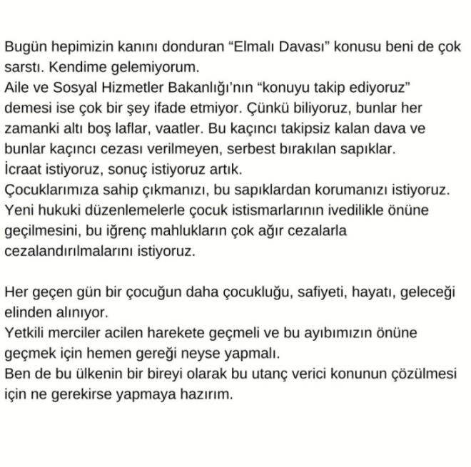 Megastar Tarkan, Antalya'da iki çocuğun i-st-smar edilmesiyle ilgili da-vada s-anıkların serbest bırakılmasına t-epki gösterdi. Sosyal medya hesabından uzun bir yazı paylaşan Tarkan, o-laydan dolayı sarsıldığını ve üzerine düşen neyse yapmaya hazır olduğunu duyurdu. Tüm Türkiye'yi derinden sarsan Elmalı davasıyla ilgili t-epkiler çığ gibi. Sosyal medya platformunda s-kandal olayla ilgili #Elmalıdavası hashtagiyle milyonlarca paylaşım yapıldı.Sanat, s-iyaset ve spor dünyası da gerek Instagram gerek Twitter'da o-laya t-epki gösterdi. Megastar Tarkan iki kardeşin m-aruz bırakıldıkları c-nsel i-st-smarıyla ilgili d-avaya i-lişkin yaptığı paylaşımda adeta i-syan bayrağını çekti.Twitter hesabından yaptığı paylaşımda Tarkan, "Bunlar her zamanki altı boş laflar, vaatler. Bu kaçıncı takipsiz kalan dava ve kaçıncı c-ezası verilmeyen, serbest bırakılan s-pıklar" yorumunu yaptı. -Tarkan, "Yetkili merciler a-cilen harekete geçmeli ve bu a-yıbımızın önüne geçmek için hemen gereği neyse yapmalı" açıklamasında bulundu.Ünlü şarkıcı, "Her geçen gün bir çocuğun daha çocukluğu, safiyeti, hayatı, geleceği elinden alınıyor. Ben de bu ülkenin bir bireyi olarak bu u-tanç verici konunun çözülmesi için ne gerekirse yapmaya hazırım" diye ekledi.