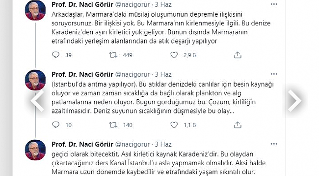 Marmara Denizi’nin yüzeyini kaplayan müsilajın beklenen büyük Marmara depremi ile i-lişkisinin olup olmadığını Prof. Dr. Naci Görür açıkladı. Bir süredir Marmara Denizi yüzeyinde biriken müsilaj yani deniz salyasının beklenen büyük Marmara depremine işareti olup olmadığı sorgulanırken,DEPREMLE İ-LİŞKİSİ YOK Prof. Dr. Naci Görür depremle müsilajin arasındaki i-lişki var mı sorularına sosyal medya hesabından şu yanıtı verdi : “Arkadaşlar, Marmara’daki müsilaj oluşumunun depremle i-lişkisini soruyorsunuz. Bir i-lişkisi yok. Bu Marmara’nın kirlenmesiyle ilgili. Bu denize Karadeniz’den aşırı kirletici yük geliyor. Bunun dışında Marmara’nın etrafındaki yerleşim alanlarından da atık deşarjı yapılıyor."GEÇİCİ OLARAK BİTECEK "(İstanbul’da arıtma yapılıyor). Bu atıklar denizdeki canlılar için besin kaynağı oluyor ve zaman zaman sıcaklığa da bağlı olarak plankton ve alg patlamalarına neden oluyor. Bugün gördüğümüz bu. Çözüm, kirliliğin azaltılmasıdır. Deniz suyunun sıcaklığının düşmesiyle bu olay… Geçici olarak bitecektir."ASIL DERS ALINMASI GEREKEN KANAL İSTANBUL'U YAPMAMAKTIR “Asıl kirletici kaynak Karadeniz’dir. Bu olaydan çıkartacağımız ders Kanal İstanbul’u asla yapmamak olmalıdır. Aksi halde Marmara uzun dönemde kaybedilir ve etrafındaki yaşam sıkıntılı olur. Sevgiyle.”